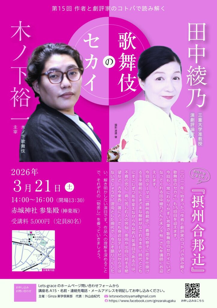 常にわかりやすい言葉で皆さんを歌舞伎のセカイにいざなってくれる田中綾乃さんと木ノ下裕一さん。深い知識と実践に裏付けられたトークは聞けば聞くほどおもしろく、私たちに今まで気づかなかった歌舞伎の魅力、深い見方を教えてくれます。